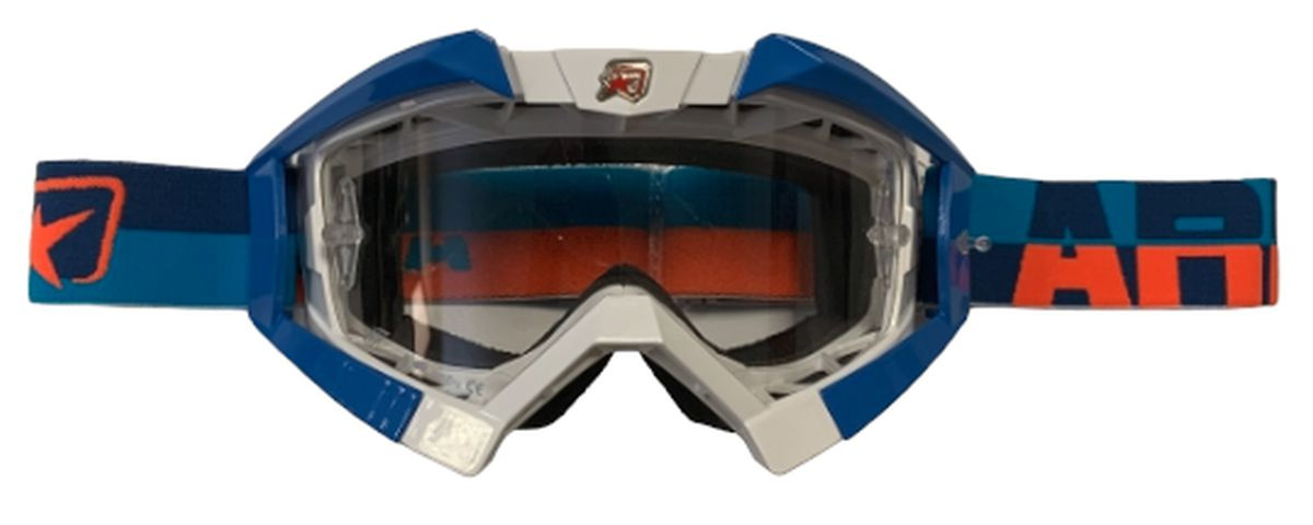 ARIETE GOGLE RIDING CROWS BASIC KOLOR BIAŁY/NIEBIESKI/POMARAŃCZOWY, SZYBKA ANTI FOG, ANTI SCRATCH, UV, ROLL-OFF READY, GĄBKA 2 WARSTWOWA
