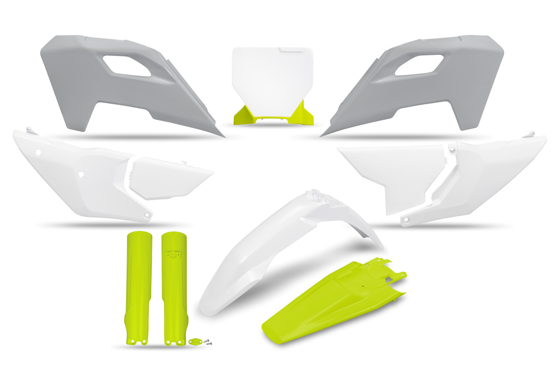 UFO 2024/11 KOMPLET PLASTIKÓW (FULL KIT) Z OSŁONAMI TELESKOPÓW (AMORTYZATORÓW) HUSQVARNA TC 125 / 250 '23-'24, FC 250 / 350 / 450 '23-'24, FX 350 / 450 '23-'24, TX 300 '24, KOLOR OEM '24 ( BIAŁY / ŻÓŁTY ) (PRZEDŁUŻONA TABLICA NA NUMER STARTOWY)