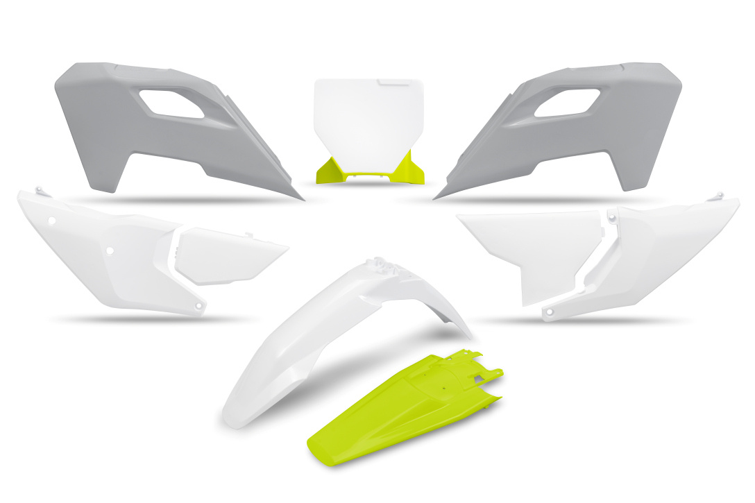 UFO 2024/11 KOMPLET PLASTIKÓW HUSQVARNA TC 125 / 250 '23-'24, FC 250 / 350 / 450 '23-'24, FX 350 / 450 '23-'24, TX 300 '24, KOLOR OEM '24 ( BIAŁY / ŻÓŁTY ) (PRZEDŁUŻONA TABLICA NA NUMER STARTOWY)