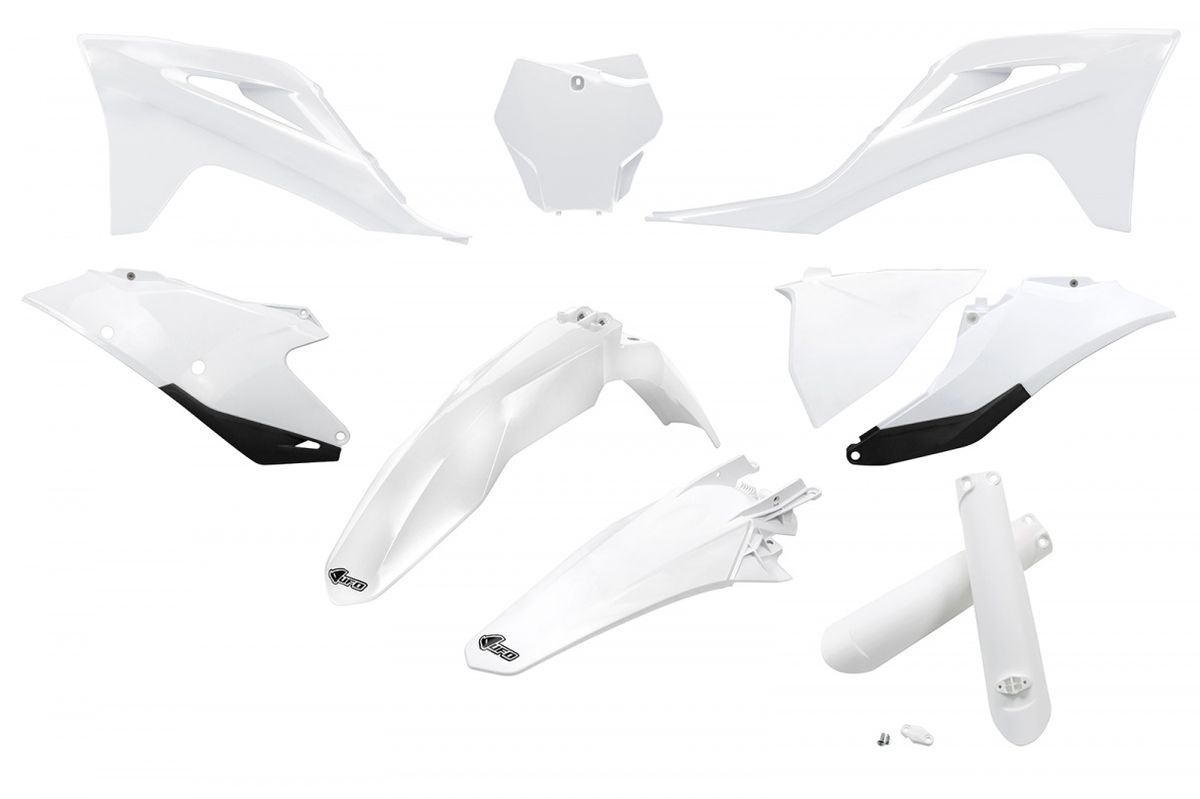 UFO KOMPLET PLASTIKÓW (FULL KIT) Z OSŁONAMI TELESKOPÓW (AMORTYZATORÓW) GAS GAS MC 125 / 250 '21-'23, EX 250 / 300 '21-'23, MC-F / EX-F 250 / 350 / 450 '21-'23 KOLOR BIAŁY
